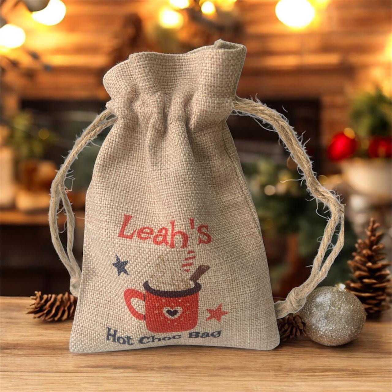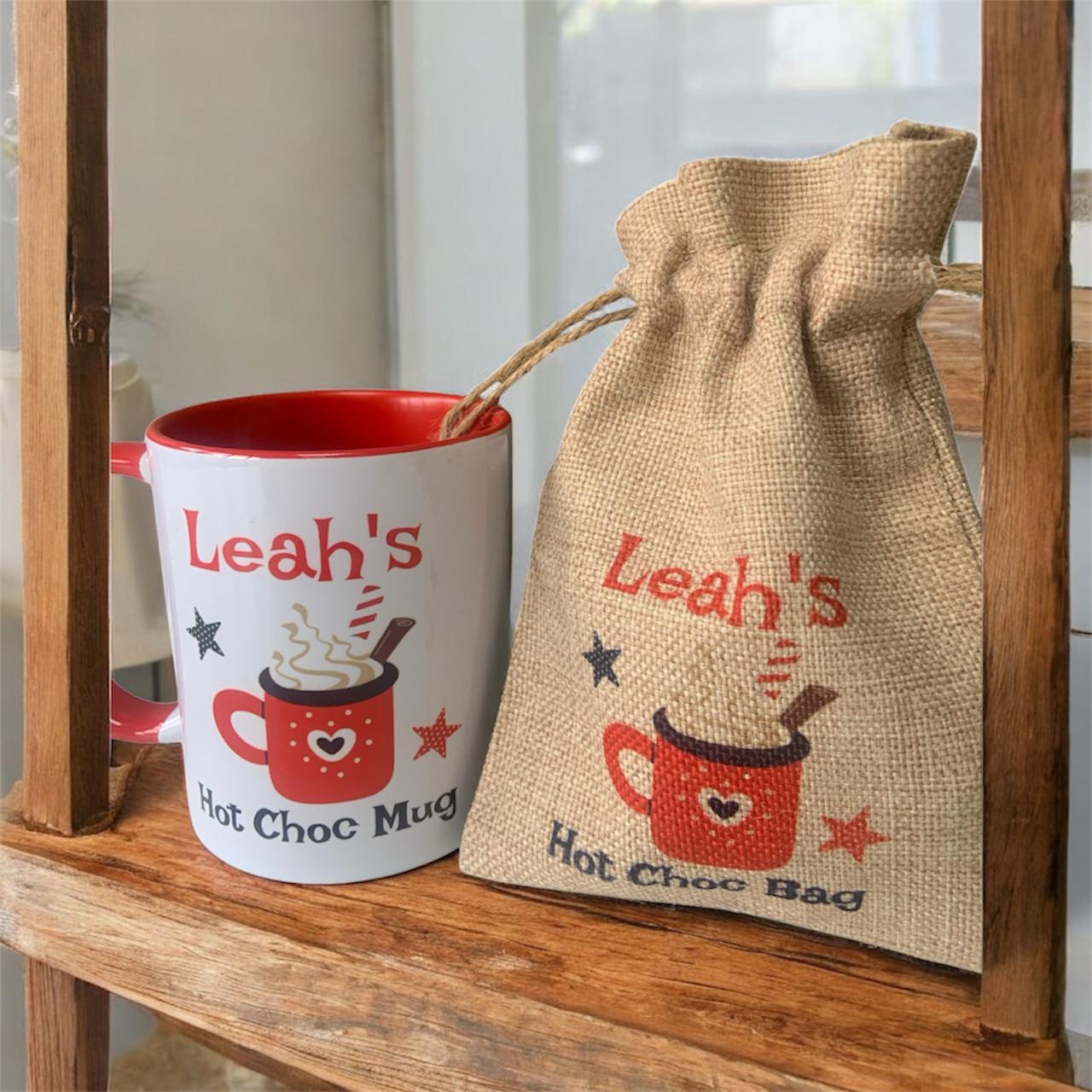Personalised Mug with matching personalised burlap drawstring bag filled with Hot Chocolate and Mini Marshmallows.