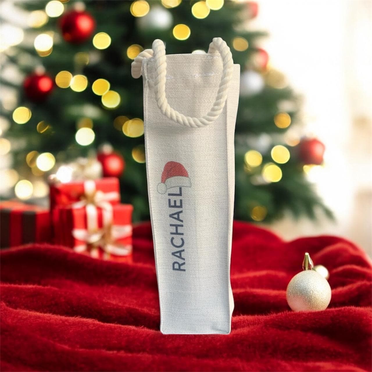 Personalised Linen Christmas Wine Bag with Rope Carry Handle.
