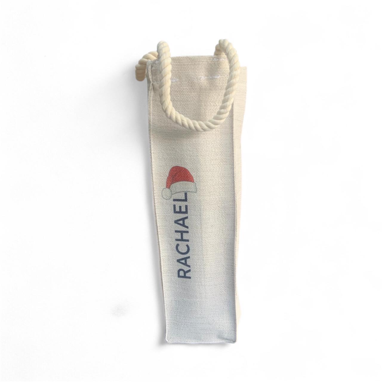 Name printed in a bold black font along the side of the bag with a Santa hat perched on top.