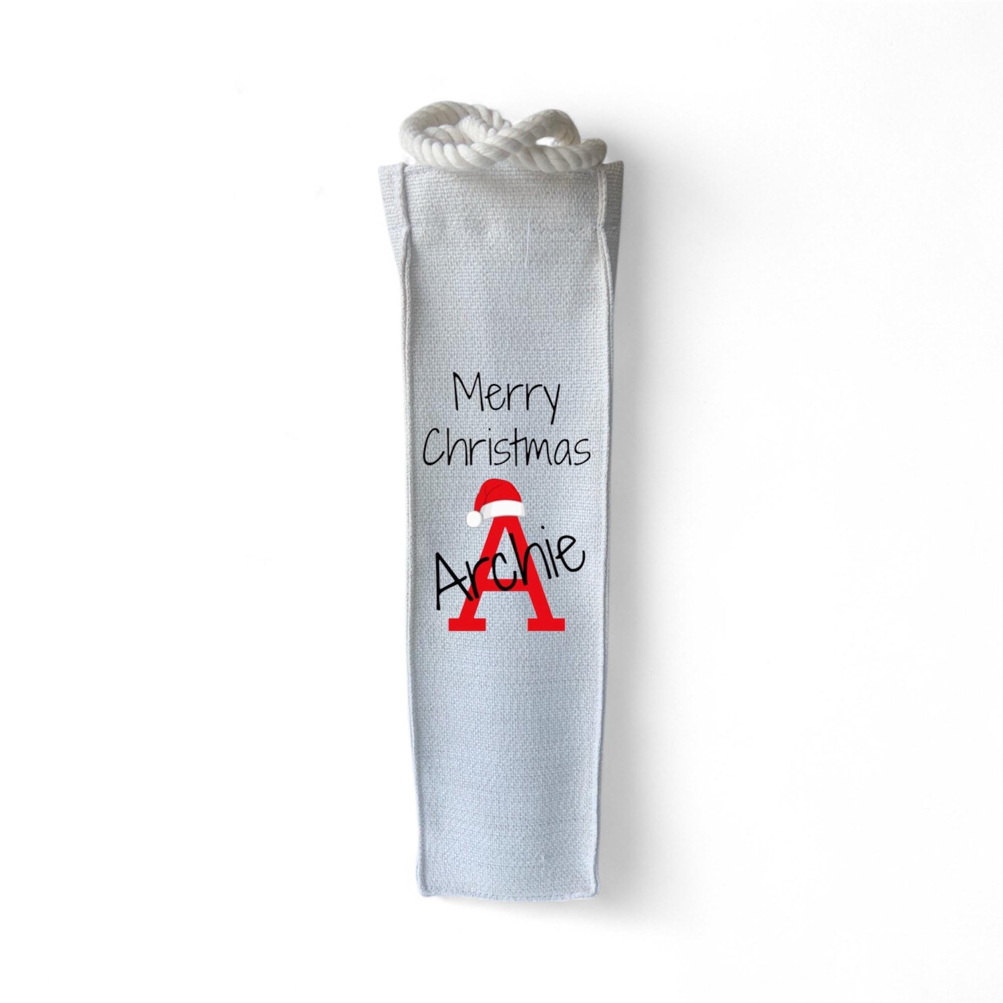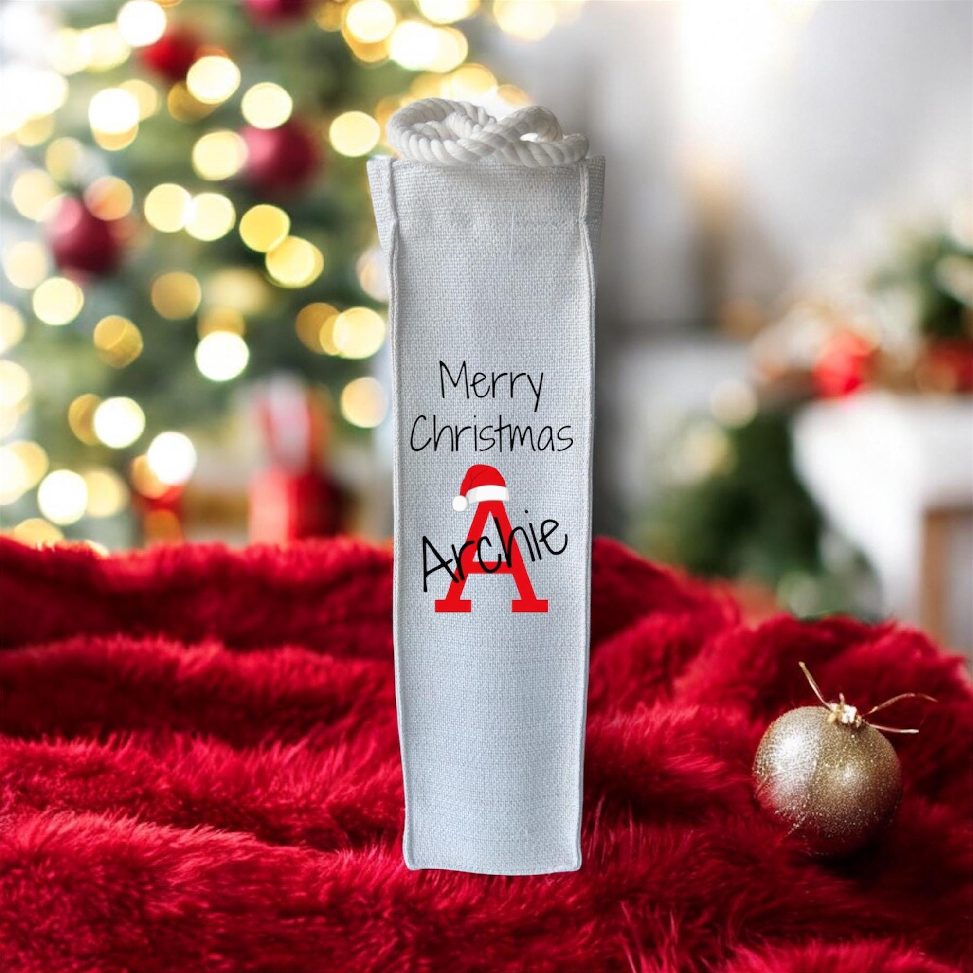 Personalised Linen Christmas Wine Bag with Rope Carry Handle.