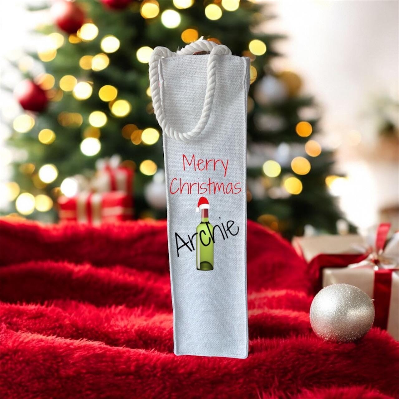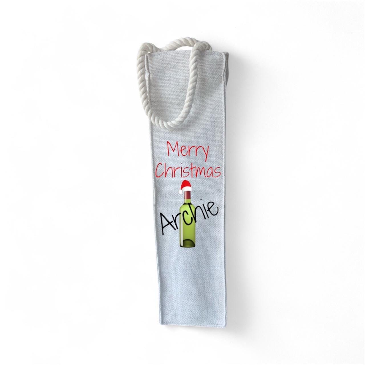 Personalised Linen Christmas Wine Bag with Rope Carry Handle.