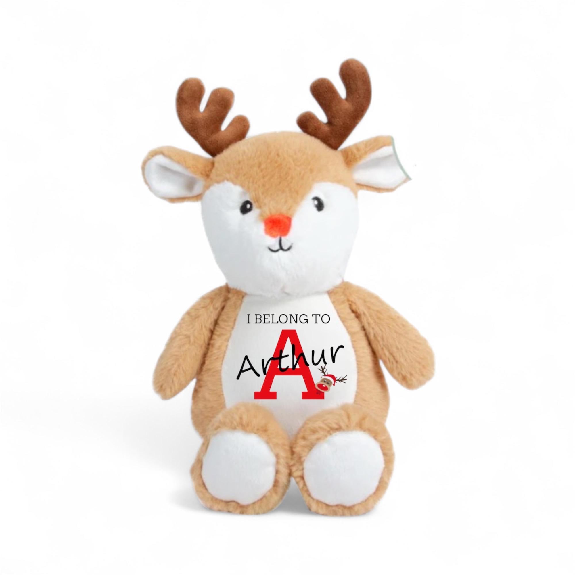Personalised name and initial with a Rudolph image is printed directly on to the belly below the words “I BELONG TO”