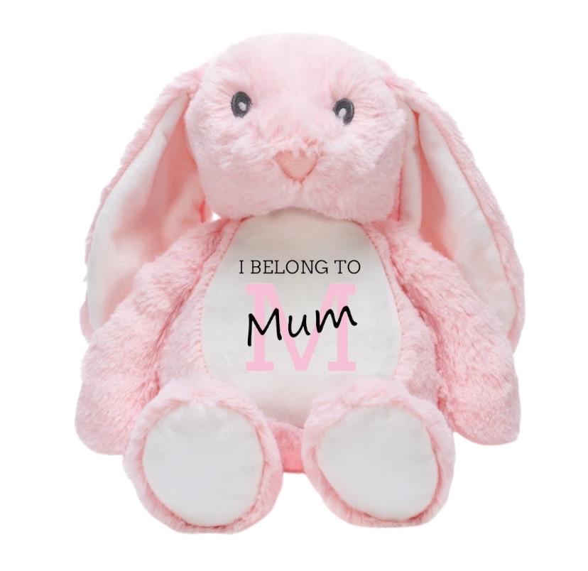 Our gorgeous pink bunny rabbit soft toy makes an ideal gift for all mums on Mother’s Day, Easter or their birthday. The soft and cuddly bunny is personalised with the word Mum in black font on top of the pink initial M. Above is printed the text “I BELONG TO”. All professionally printed creating a unique and thoughtful gift to keep forever.