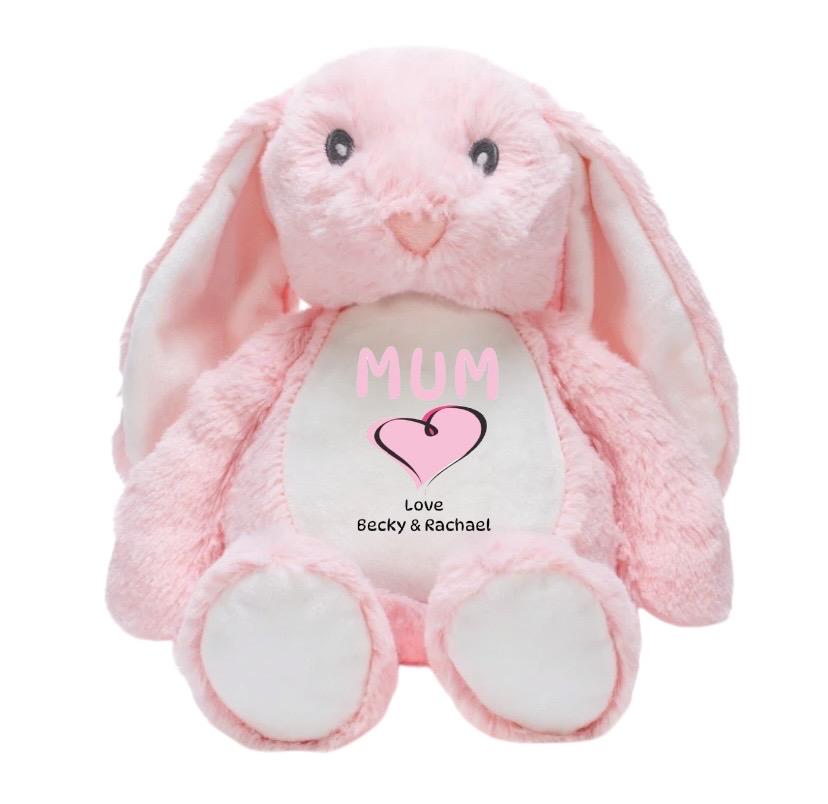 Our gorgeous personalised pink bunny rabbit soft toy makes an ideal gift for all mums on Mother’s Day or their birthday. The soft and cuddly bunny is personalised with the word MUM in pink font above the pink heart. Underneath is printed the sender’s name(s). All professionally printed creating a unique and thoughtful gift to keep forever.