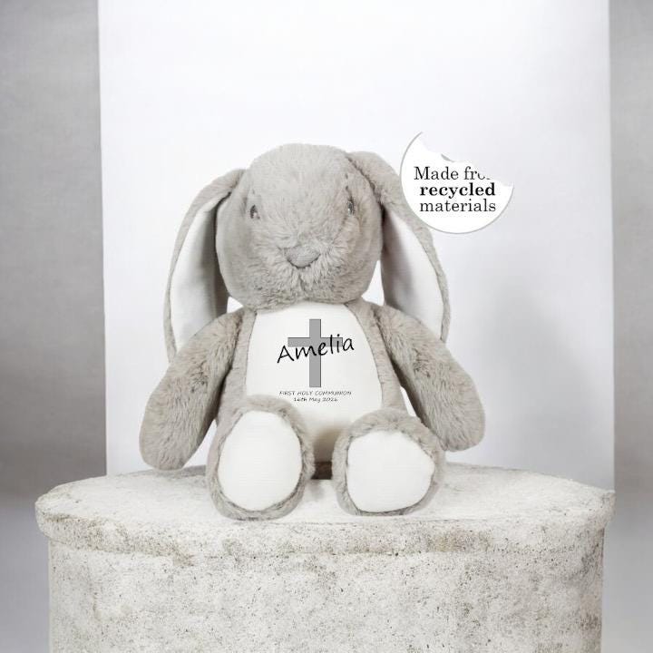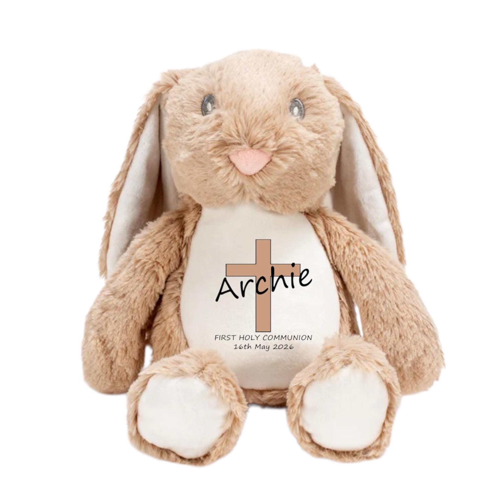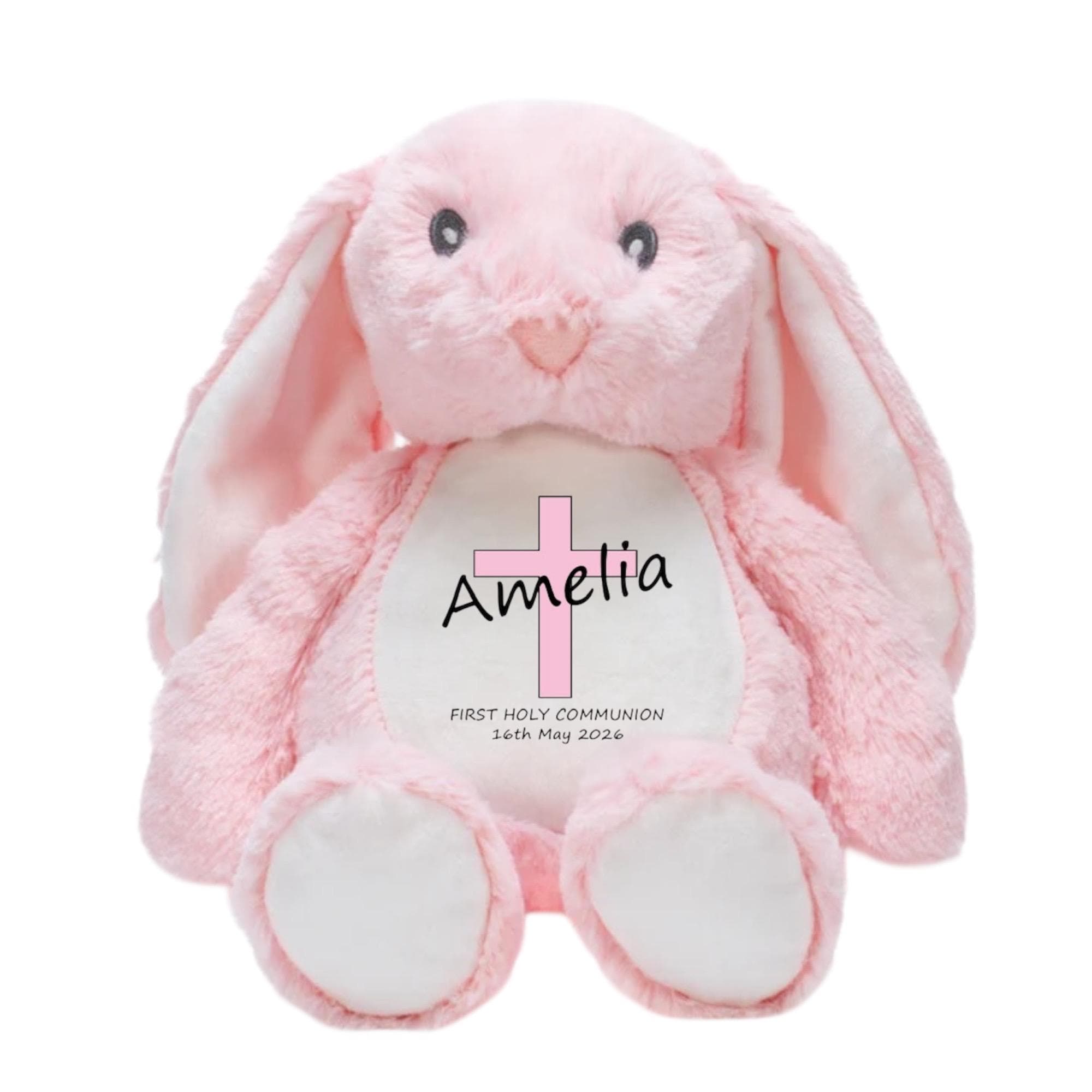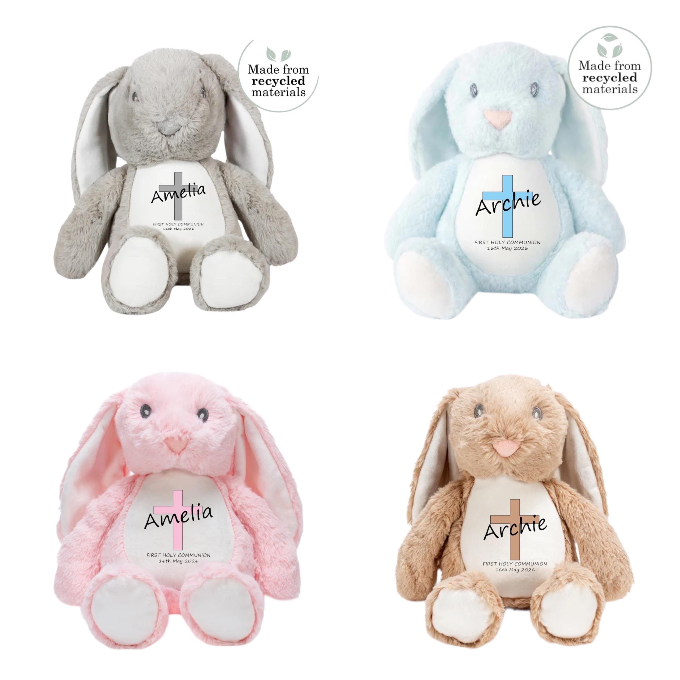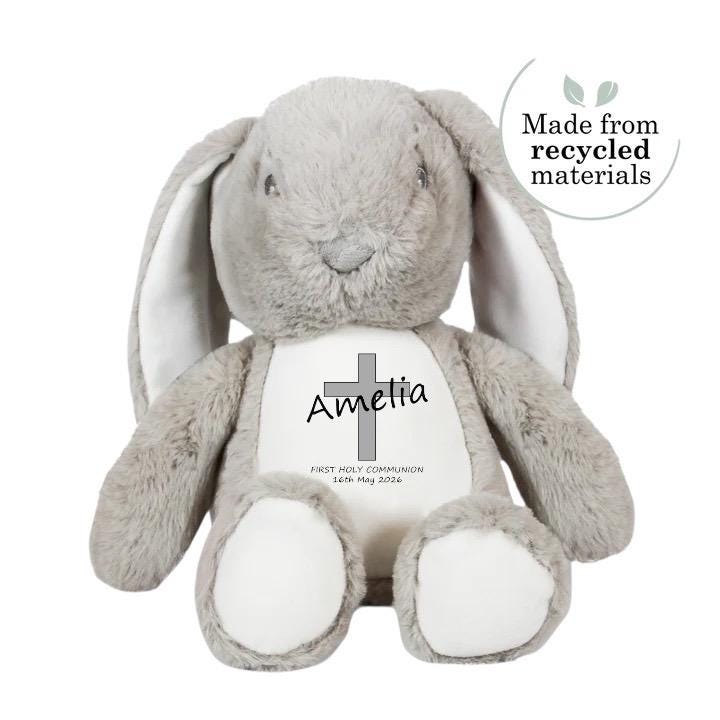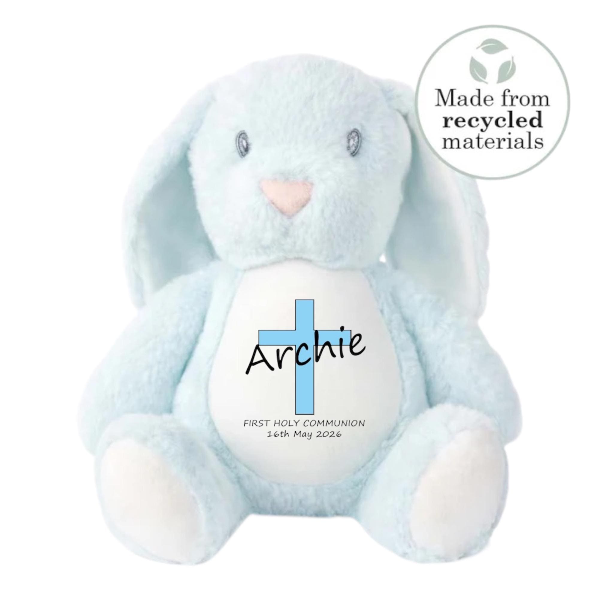 Our gorgeous personalised bunny rabbit soft toy makes an ideal gift for any boy or girl on their First Holy Communion. The soft and cuddly bunny can be personalised with any name printed over the matching colour cross along with the date professionally printed below the words First Holy Communion creating a unique and thoughtful gift to keep forever.