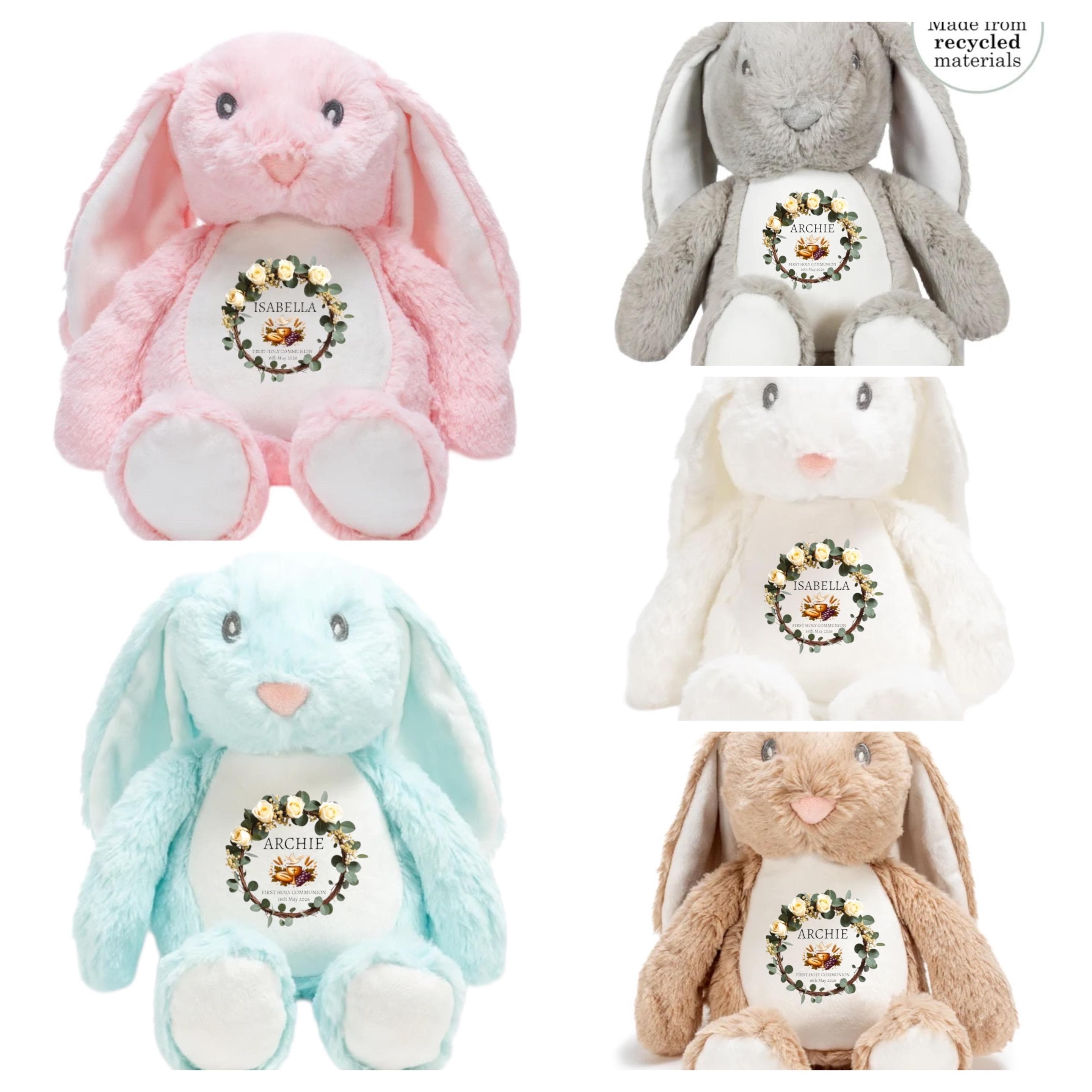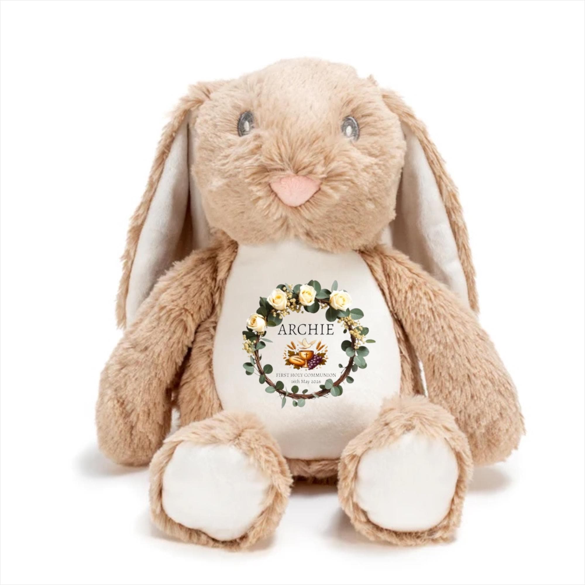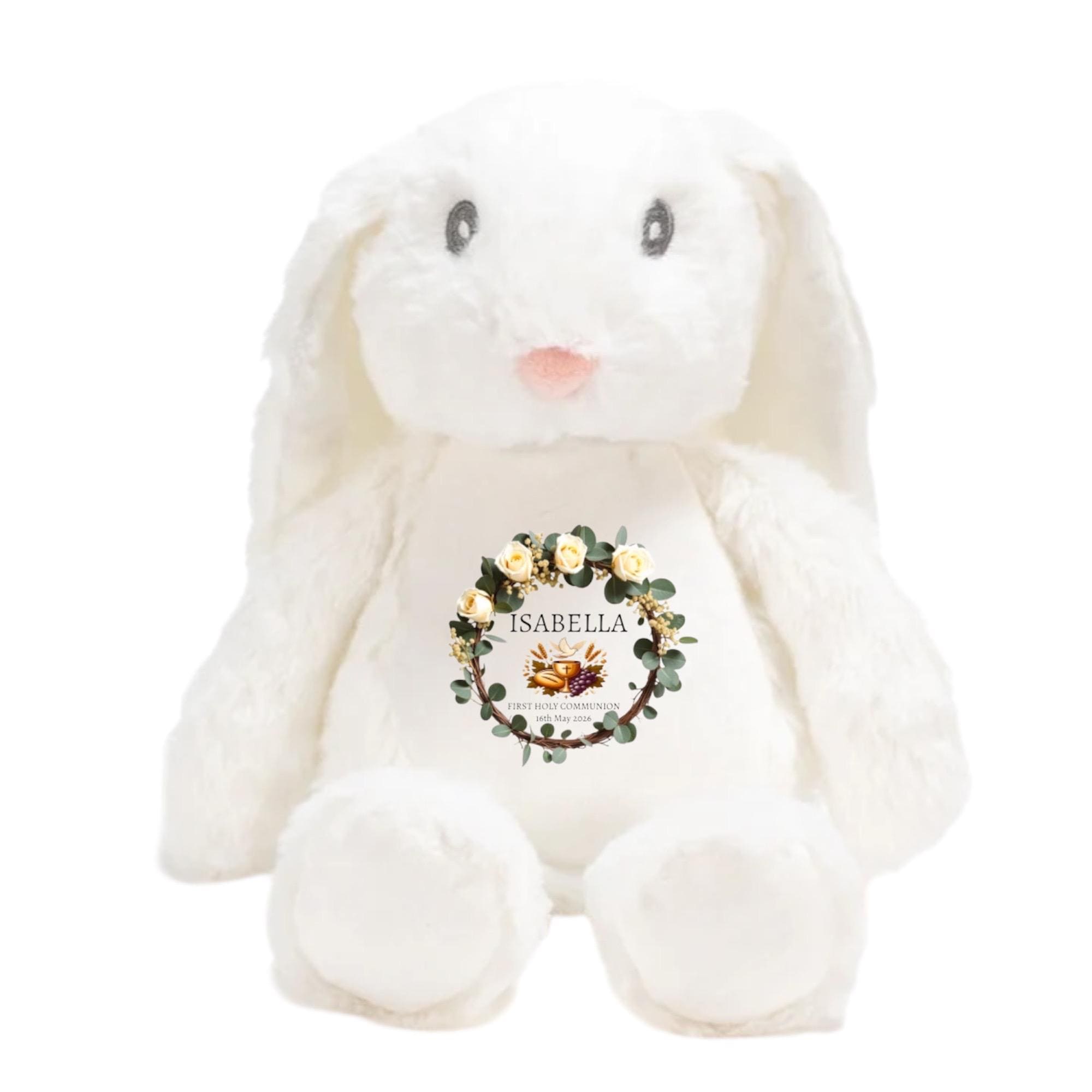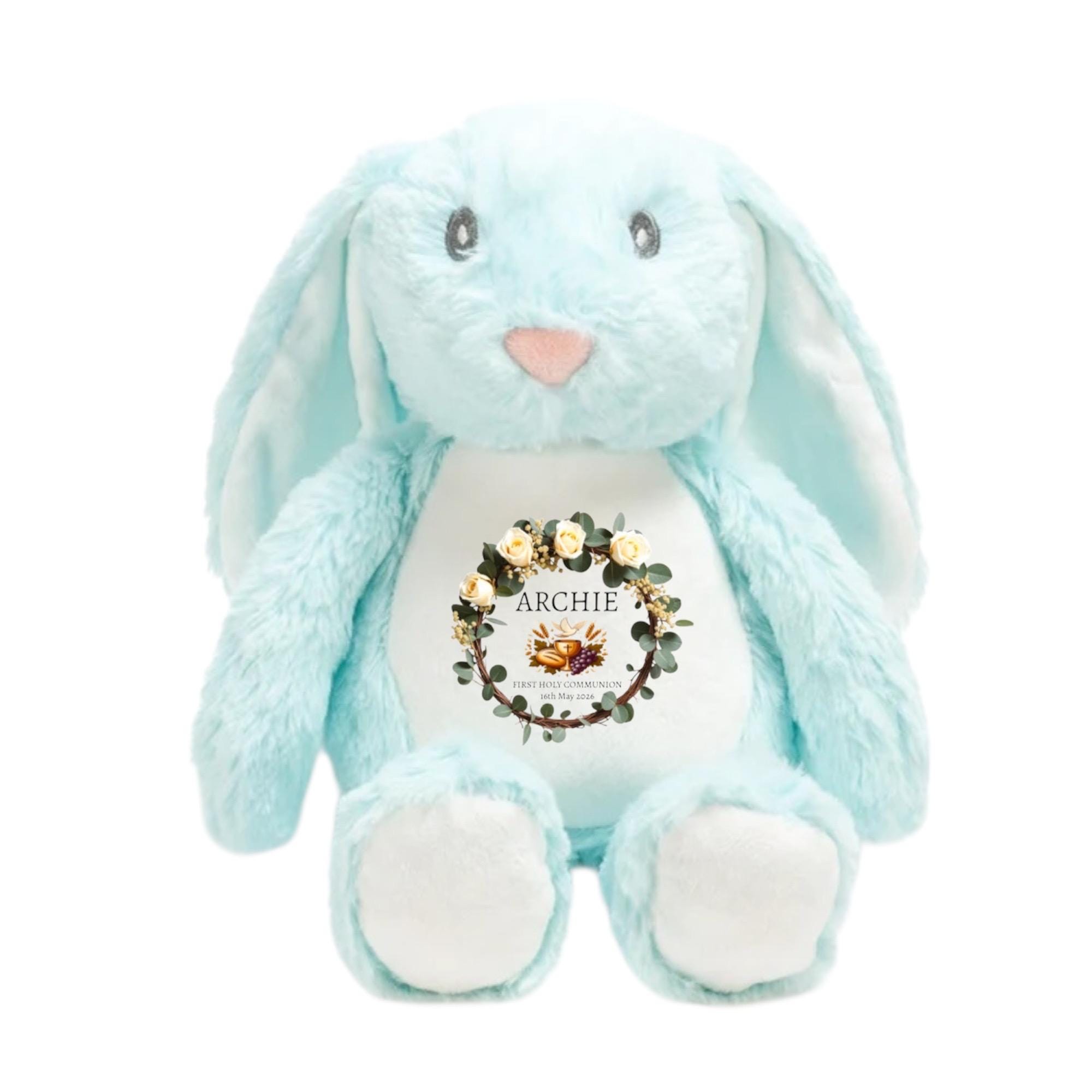 The soft and cuddly bunny can be personalised with any name printed with the floral border and image of the Eucharist along with the date professionally printed below the words First Holy Communion creating a unique and thoughtful gift to keep forever.